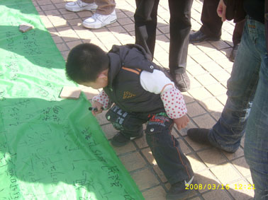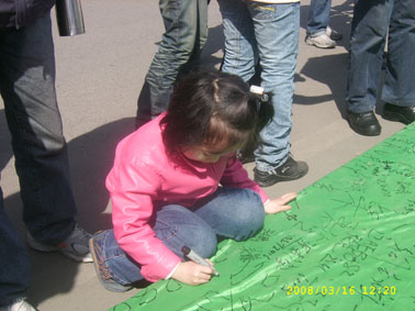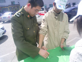 3月16日,為倡議有車族參與本活動(dòng),加強(qiáng)對(duì)廢油液排放的監(jiān)督,來自?shī)W吉娜、東北大學(xué)、沈陽(yáng)大學(xué)、中國(guó)醫(yī)大的環(huán)保志愿者組成了近千人的宣傳隊(duì),在桃仙機(jī)場(chǎng)、北方圖書城、卓展商場(chǎng)、每家瑪、家樂福金牛店、麥德龍展開了宣傳。上午10時(shí),活動(dòng)現(xiàn)場(chǎng)設(shè)置了“支持回收車用廢棄油液-利國(guó)利民利已利后世”條幅和巨幅“迎奧運(yùn)天藍(lán)水清地綠-車用廢棄油液回收活動(dòng)之沈城十萬(wàn)駕車者聯(lián)合簽名”錦旗,志愿者現(xiàn)場(chǎng)講解車用油液對(duì)環(huán)保的危害,倡議有車人士對(duì)隨意排放現(xiàn)象進(jìn)行監(jiān)督?;顒?dòng)得到有車族的積極響應(yīng)與大力支持,不到半天,已有近萬(wàn)名應(yīng)倡者在錦旗上簽名,從中可以看出沈陽(yáng)市民迎接奧運(yùn)的熱情和對(duì)和諧社會(huì)的向往,體現(xiàn)了沈陽(yáng)市民普遍具有較強(qiáng)的環(huán)保意識(shí)和責(zé)任感。