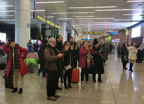 (圖)在沈陽桃仙國際機場齊頌《沁園春·雪》時,一群外國友人為奧吉娜集團(tuán)科創(chuàng)先鋒團(tuán)拍照鼓掌,他們沒想到中國人是如此崇拜毛澤東主席。