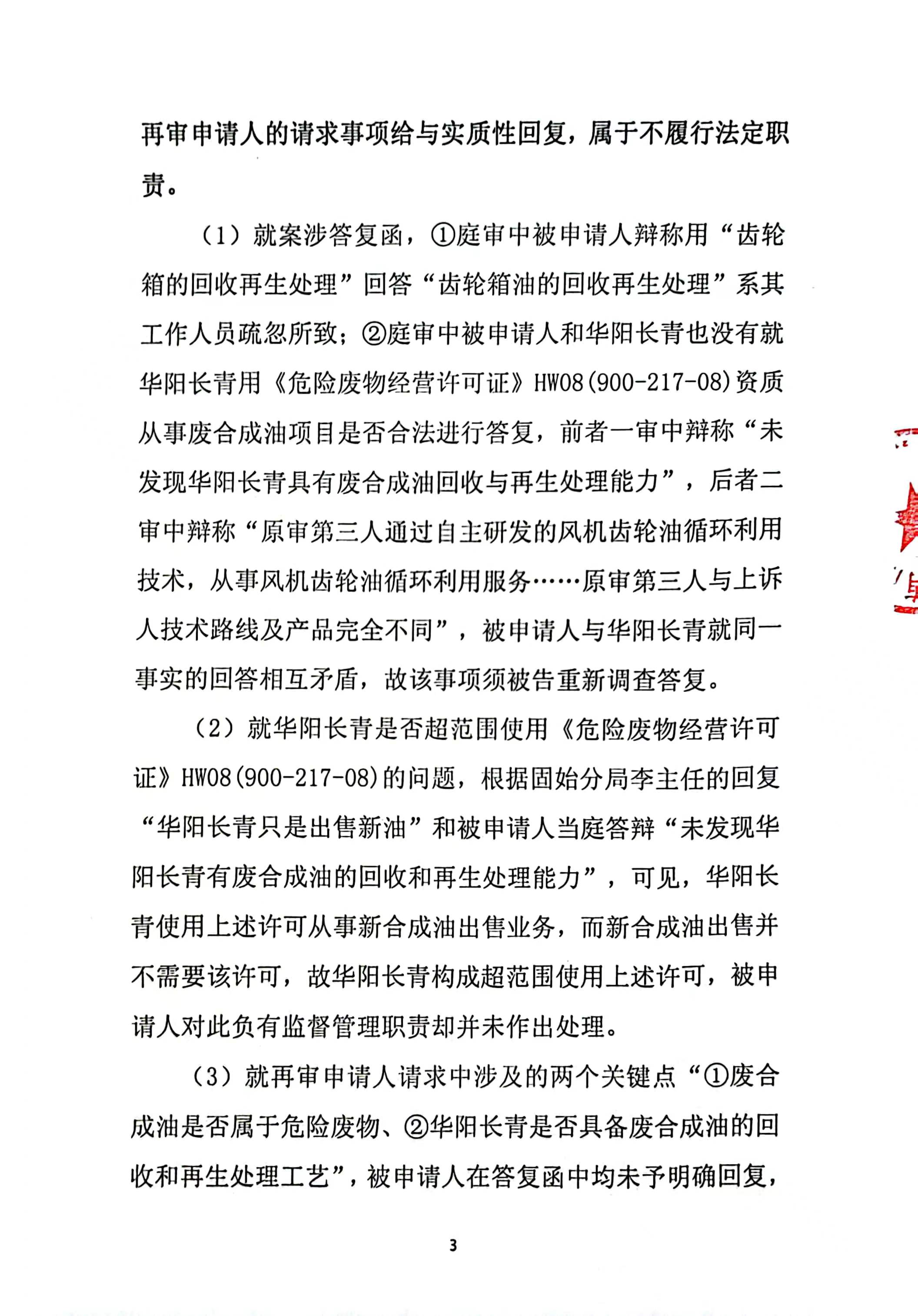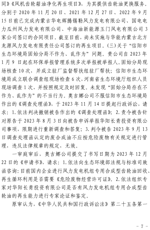 2023年3月9日,奧吉娜公司收到固始分局通過12369環境信訪平臺的短信答復:“反映問題不屬實”。3月10日,奧吉娜公司向固始分局負責人電話詢問,其解釋稱:經調查核實,華陽長青公司沒有再生風電潤滑油銷售,出售的是新油。否定了奧吉娜公司的舉報內容。對此,奧吉娜公司表示強烈不滿。3月11日,奧吉娜公司向環境部投訴固始分局的不作為和亂作為。2023年5月26日,奧吉娜公司收到12369環境信訪平臺的短信答復。答復部門為信陽環境局。令人啼笑皆非的是,答復稱,華陽長青的許可證有效期沒有問題,與舉報內容風馬牛不相及。2023年6月13日,奧吉娜公司再次向環境部提出申訴,指出,奧吉娜舉報的不是許可證有效期問題,而是許可證的適用范圍錯誤、違法。2023年7月27日,奧吉娜公司收到回復稱,經信陽市生態環境局現場檢查,未發現固始分局不作為情況。2023年8月3日,奧吉娜公司向河南省生態環境廳(以下稱:環境廳)舉報信陽環境局包庇固始分局的行為。環境廳對此高度重視,有關處長和奧吉娜公司負責人進行了面談。2023年9月13日,信陽環境局向奧吉娜公司致《信陽市生態環境局關于沈陽奧吉娜化工有限公司舉報華陽長青投資有限公司違法經營及固始分局不作為、亂作為等問題調查處理的函》。函中:一是,以“齒輪箱”替換“齒輪箱油”,偷換概念;二是,做出了廢風電合成(齒輪)油不屬于危險廢物的結論;三是,未發現固始分局存在不作為、亂作為的不當行為。再次否定奧吉娜公司的舉報和投訴。