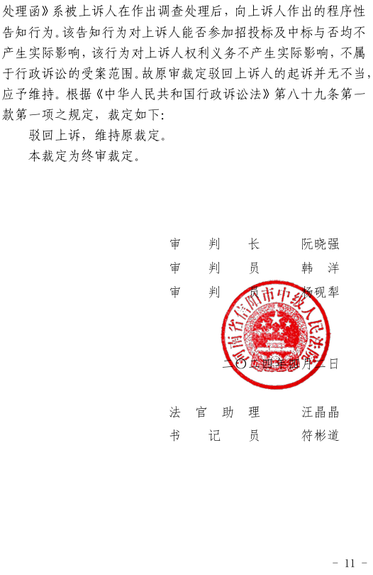 二審法院裁定的理由是:二審經審理查明的事實與原審查明事實一致,不屬于行政訴訟的受案范圍【詳見下附一:《河南省信陽市中級人民法院行政裁定書》(共11頁)】。