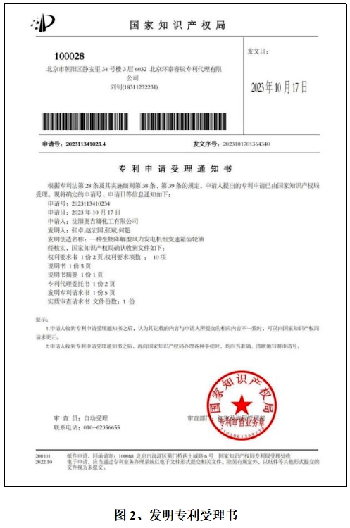 奧吉娜在國內首先提出生物降解型風力發電機組變速箱齒輪油,并已成功研究生產出相關產品,該產品的相關技術數據已向國家知識產權總局申請了該領域的發明專利(見圖2)。